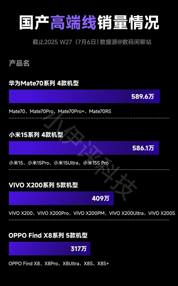 从FindX8的销量来看,确实不如友商同级别的机型。根据数码博主曝光的截至2025年第27周(7月6日)的累计激活销量数据显示,华为Mate70系列以589.6万部的销量,位列第一;小米15系列以586.1万部的销量,位居第二;vivoX200系列以409.2万部的销量,排名第三。相比其他三款旗舰系列,OPPOFindX8系列的销量相对较低,以317.5万部位列第四。